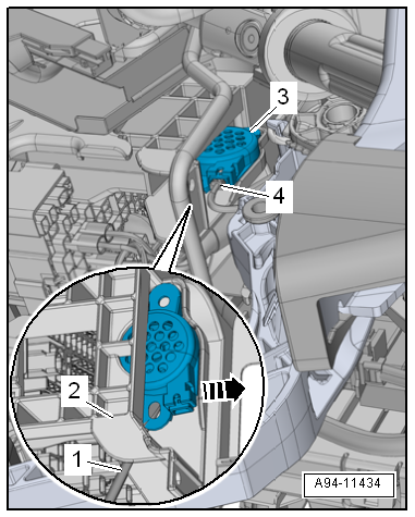 - Quitar hacia abajo el soporte -1- del soporte para la unidad de control de la red de a bordo -3-.