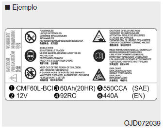 La etiqueta de la batería actual del vehículo puede ser diferente a la de la ilustración.