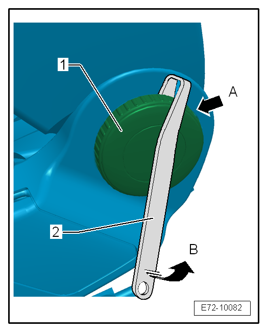 - Enganchar la herramienta de montaje -3399- al encastre y levantar la manivela -flecha B-.