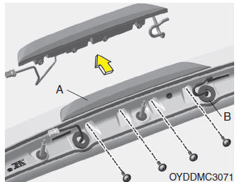 5.Desmonte el conjunto de la tercera luz de freno (A) después de aflojar las tuercas y la boquilla del lavaparabrisas (B).