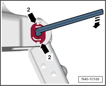 - Desacoplar el conector eléctrico -1-. Para ello, introducir la mano por detrás del refuerzo anticolisión, presionar el fiador, girar el estribo de sujeción y retirar el conector.