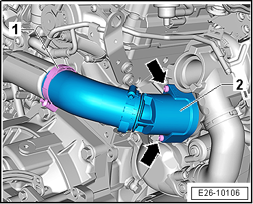 - Desenroscar el tornillo -2-, pivotar hacia atrás el tubo de conducción de aire con el manguito de aspiración y extraerlos del turbocompresor de gases de escape.