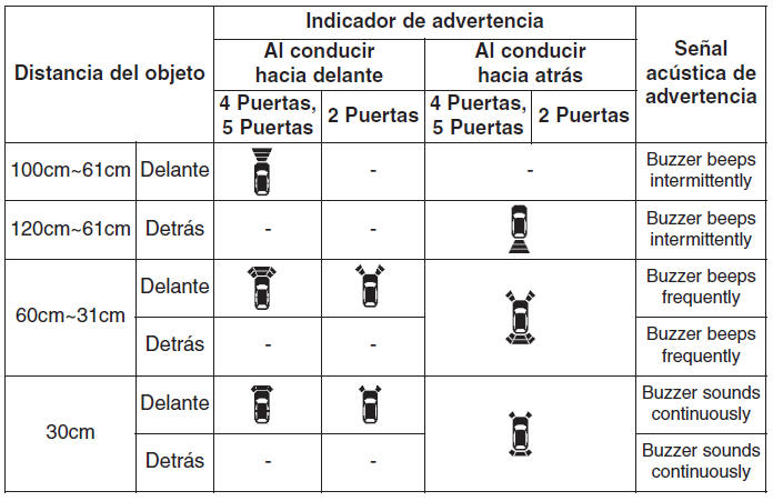 1. La señal acústica de advertencia puede no sonar secuencialmente dependiendo de la velocidad y las fomas de los objetos detectados.