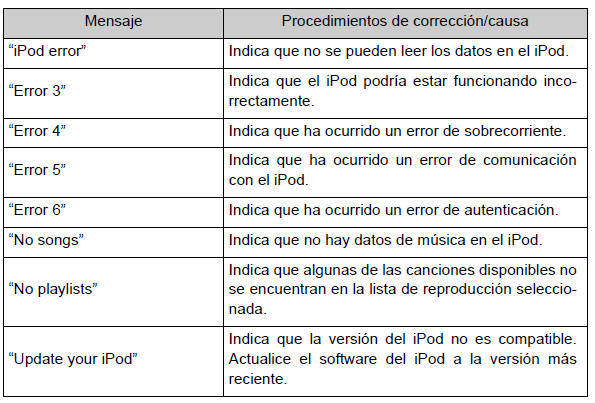 Para resolver la mayoría de los problemas encontrados al usar su iPod, desconecte el iPod de la conexión para iPod del vehículo y reinícielo. Para obtener información sobre cómo reiniciar su iPod, consulte el Manual del propietario del iPod.